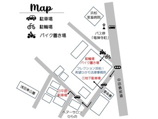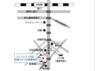 ◆当事務所は、浜松駅南口から中田島街道を南に歩いて13分ほどのところにございます。「フレクション浜松Ⅰ」という6階建てマンションの2階になります。